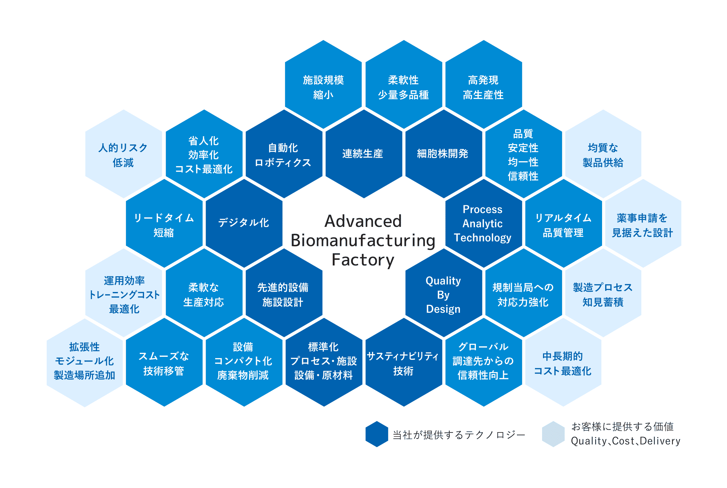 先進バイオ生産技術はお客様から見た価値を実現するための手段であり、真のゴールはお客様を通じて患者様が必要とする価値を実現することであると考えます。だからこそ、求めるゴールを実現するためには、手段である先進的生産技術を追求し、磨き上げ続けることが重要であると私達は考えています。